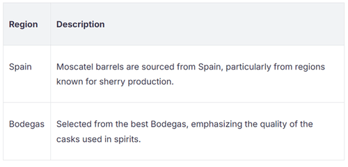 Moscatel casks come from places known for sweet wines. Most of these casks are from Spain. They are picked from areas famous for making sherry. Makers choose barrels from top bodegas. Bodegas are special wine cellars that care about quality. The Moscatel wine in these casks uses Muscat of Alexandria grapes. These grapes grow near Chipiona in sandy soil. The sandy ground helps the grapes taste special. The wine made from them is sweet and smells like flowers. This flavor goes into the cask and then into the spirit.