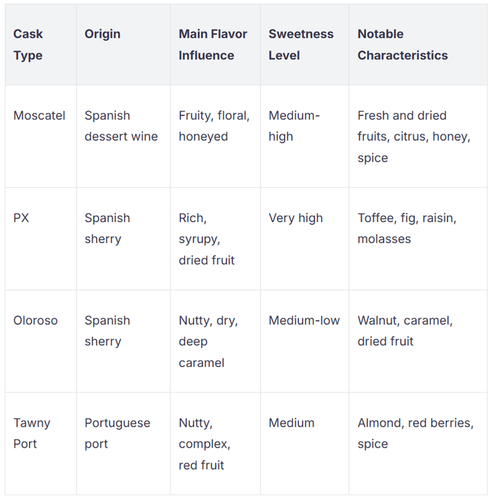 Moscatel casks give more fruit and flower flavors. PX casks make spirits very sweet with dried fruit tastes. Oloroso casks add nutty and dry flavors. Tawny Port casks bring nutty and complex tastes with red fruit and spice.