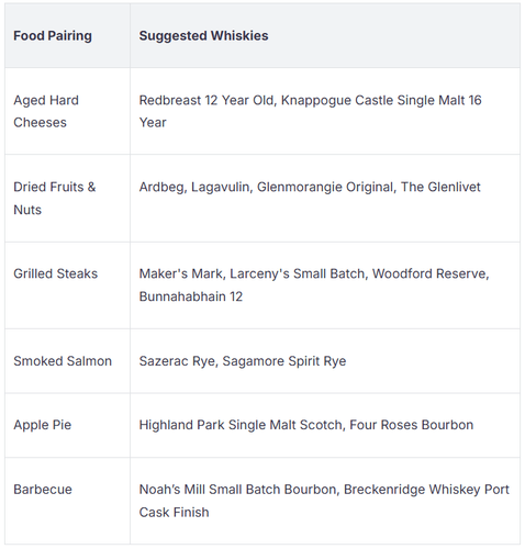 Food pairing can make your whisky tasting even better. You can match different whiskies with foods that bring out their best flavours. Here’s a table with some top food pairing ideas: