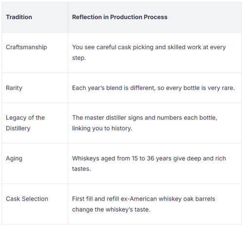 When you learn about Midleton Very Rare, you see it values old ways. Each bottle connects you to the long story of Midleton Distillery. The 2026 bottle keeps this tradition by using classic methods. You can see which traditions shape this whiskey in the table below: