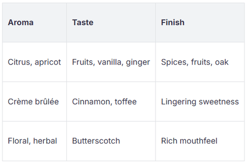 You taste many fruits. Vanilla and cinnamon add warmth. Peeled ginger and lemon zest make it fresh and crisp. Butterscotch and toffee give rich flavors. The pot still style covers your mouth. The finish starts with pot still spices. Fruits and oak stay until the end.
