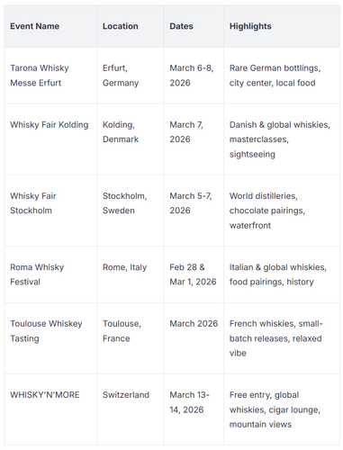 You can visit the best whiskey events in Europe this March. Go to Tarona Whisky Messe Erfurt in Germany from March 6 to 8. Whisky Fair Kolding happens in Denmark on March 7. Whisky Fair Stockholm is in Sweden from March 5 to 7. Roma Whisky Festival is in Italy on February 28 and March 1. Toulouse Whiskey Tasting is in France. WHISKY'N'MORE is in Switzerland on March 13 and 14. Each event has special tastings, rare bottles, or local drinks. These festivals are great for beginners, collectors, and travelers. Make your weekend plans early. Check the BRAUWELT CALENDAR and Whisky Festivals Calendar 2026/2027 for more ideas. Spiritory's Germany guide gives more help.