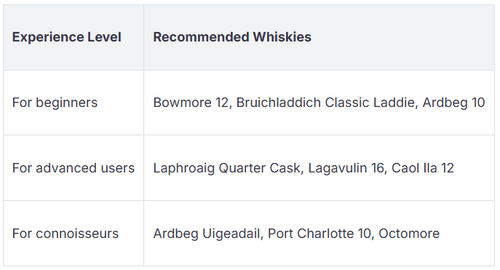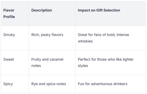 Menschen mögen verschiedene Aromen im Whisky. Einige genießen rauchige und starke Geschmäcker. Andere bevorzugen süße oder würzige Aromen. Schauen Sie sich diese Tabelle an, um zu sehen, was am besten passt:
