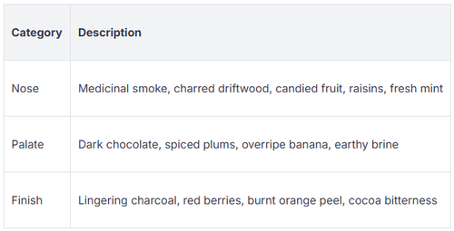 Wenn Sie einen Schluck nehmen, schmecken Sie dunkle Schokolade und würzige Pflaumen. Dann schmecken Sie überreife Banane und salzige Erde. Diese Aromen machen den Whisky reichhaltig und ausgewogen. Der Abgang bleibt bei Ihnen. Sie schmecken Holzkohle, rote Beeren, verbrannte Orangenschale und ein wenig Kakaobitterkeit. Das macht den Whisky zu einer Reise von Anfang bis Ende. Viele Whisky-Fans suchen nach diesen besonderen Geschmacksmischungen in einer Flasche.