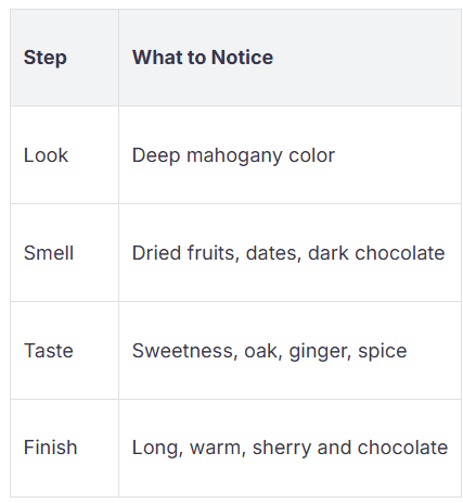 Wenn du diesen Whisky einschenkst, siehst du eine tiefe Mahagoni-Farbe. Diese Farbe zeigt die reichen Aromen im Inneren. Wenn du daran riechst, bemerkst du getrocknete Früchte, süße Datteln und dunkle Schokolade. Auch Ingwer und Eiche riechst du. Diese Aromen stammen von der langen Zeit in Sherryfässern.