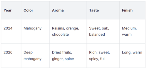 Der Geschmack im Jahr 2024 war ausgewogen, mit süßen und holzigen Aromen. Die 2026 Flasche bietet dir ein reichhaltigeres Mundgefühl und etwas mehr Gewürze. Du wirst wahrscheinlich bemerken, dass Ingwer und dunkle Schokolade 2026 mehr herausstechen. Der Abgang in 2026 dauert länger und fühlt sich wärmer an.