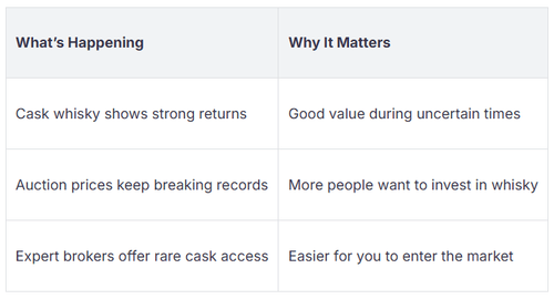 Vous voyez de plus en plus de collectionneurs et d'investisseurs se tourner vers le whisky comme un moyen de faire croître leur argent. Le marché du whisky en fût a montré de la force, même lorsque d'autres investissements semblent risqués. Certaines entreprises, comme Riverside Whisky Partners, vous aident à trouver des fûts rares et à donner des conseils d'experts. Vous pouvez participer à des enchères ou travailler avec des courtiers pour accéder à des sorties spéciales.