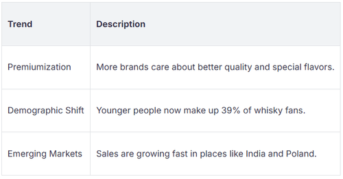 Les tendances du whisky changent. Les gens veulent une meilleure qualité et de nouvelles saveurs. Essayez de nouvelles marques qui utilisent des fûts spéciaux.