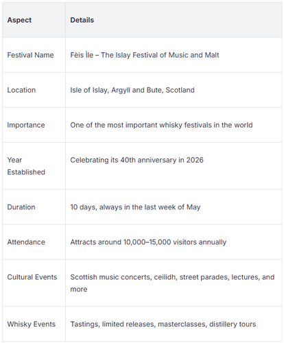 Fèis Ìle is one of the biggest whisky festivals in Scotland. It happens on the Isle of Islay every May. The festival lasts ten days and will be 40 years old in 2026. You will see whisky influencers, music fans, and travelers from many places. Here is a quick look at what makes Fèis Ìle special: